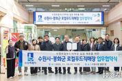 [경기헤드라인=문수철 기자] 수원특례시와 봉화군농어업회의소는 19일 수원시청에서 로컬푸드 입점 협약을 체결했다. 협약식은 이날 시청 별관 앞에서 열린 ‘봉화 수원 캠핑장 개장 기념 농산물 직거래장터’에서 진행됐다. 수원시는 인구소멸 위기 지역 농가의 안정적 판로 확보를 지원하고, 시민에게 신선한 지역 농산물을 제공할 예정이다. 협약식에는 남상은 수원시 농업기술센터 소장, 김주익 봉화군농어업회의소 회장, 신종길 봉화군 농업기술센터 소장 등이 참석했다. 봉화 수원 캠핑장 개장 기념 농산물 직거래장터에는 수원시·봉화군·수원농협·하나로마트 수원점이 참여했다. 수원로컬푸드직매장은 상추·배추·표고버섯 등 농산물을, 봉화군은 사과·생강·고구마·마 등 주요 특산물을 판매했다. 하나로마트 수원점은 감, 인삼, 대추, 새우젓, 멸치 등 통영·사천·김천 등의 농산물을 판매했다. 방문객에게 정다미 500g 200개와 장바구니 200개를 제공하는 행사도 진행했다. 수원시 관계자는 “수원시민에게 신선한 로컬푸드를 제공하고, 인구소멸 위기 지역 농가와 상생 협력할 수 있는 기반을 마련했다”며 “지역 농가와 시민