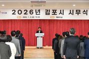 [경기헤드라인=문수철 기자] 김포시가 2일 오전 10시, 시청 본관 3층 대회의실에서 ‘2026년도 시무식’을 열고 붉은 말 병오년(丙午年) 새해의 힘찬 출발을 알렸다. 이날 시무식에는 김병수 김포시장을 비롯해 실·국·소장, 부서장 등 간부 공직자 100여 명이 참석해 새해 시정 운영 방향을 공유하고, 시민 중심의 시정 추진과 새로운 도약을 향한 결의를 다졌다. 행사는 국민의례를 시작으로 공무원 헌장 낭독, 신년사 순으로 차분하고 엄숙하게 진행됐으며, 참석자들은 시무식을 통해 공직자로서의 사명과 책임을 다시 한 번 되새기는 시간을 가졌다. 김병수 김포시장은 신년사에서 “붉은 말의 해는 뜨거운 열정과 강한 추진력을 상징한다”며 “올해는 이 기운을 받아 ‘시민의 상상이 현실이 되는 김포’를 시민 한 분 한 분이 실제로 느낄 수 있도록 시정 역량을 집중해 나가겠다”고 밝혔다. 아울러 “속도감 있는 행정과 책임 있는 실천으로 김포의 미래 경쟁력을 더욱 높여 나가겠다”고 덧붙였다. 한편, 시무식을 마친 뒤 참석자들은 서로 새해 인사를 나누며 올 한 해 시정 운영에 대한 각오를 공유하는 시간을 가졌으며, 시민